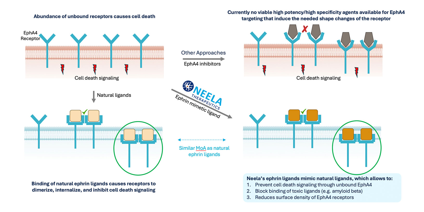 Neela’s Efralex small molecule mimics the natural interaction of ephrin, causing excessive unbound EphA4 receptor to be internalized into the cells. This prevents aberrant binding to amyloid beta or other toxic interaction partners and also inhibits cell death signaling caused by excessive unbound EphA4 receptor.